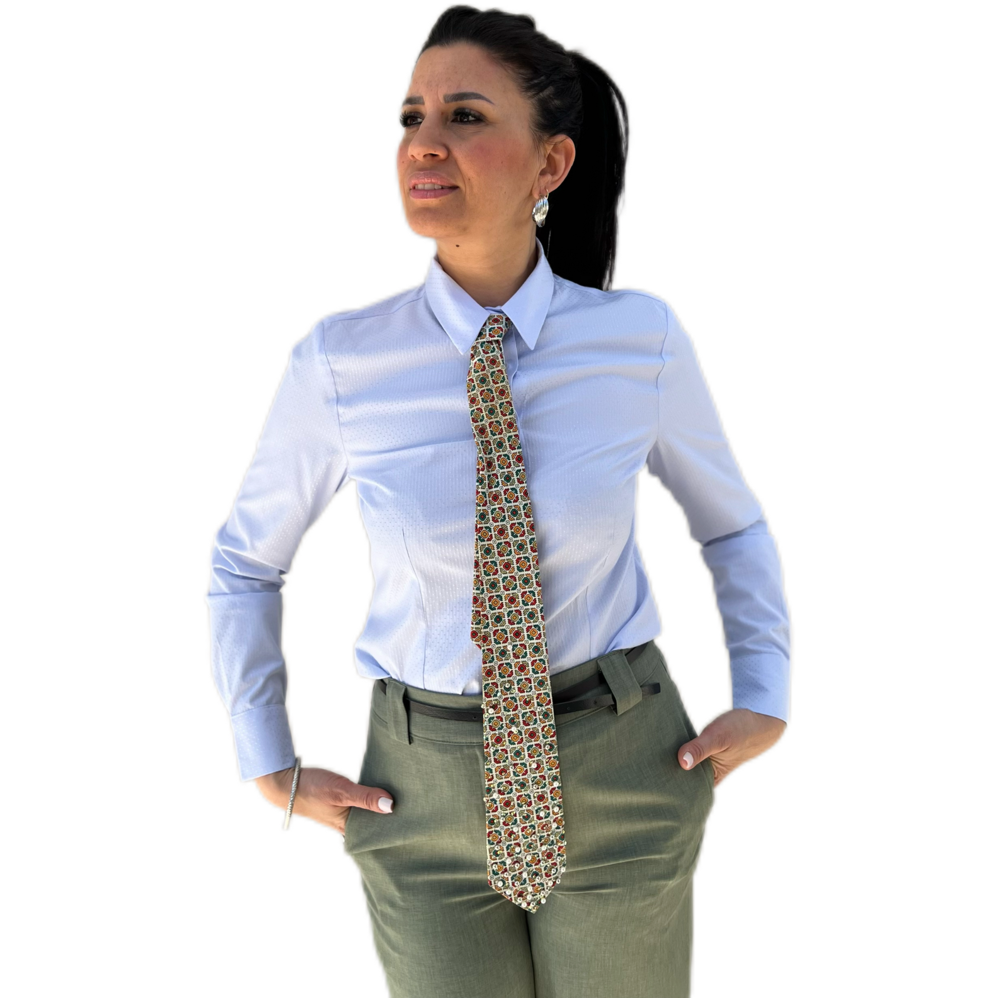Camicia colore cielo con cravatta arancio/verde